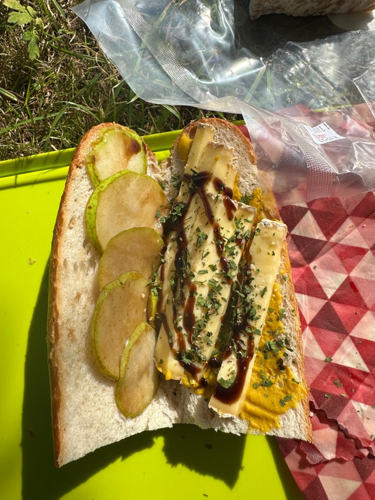 Am Morgen habe ich gesandwiched. Sautierte lokale Birnen mit Balsamico, local cheese und Senf. Die Nüsse habe ich vergessen, obwohl vorhanden. Ich Aff. Ich habe es doch studiert ☝️. Nervig.