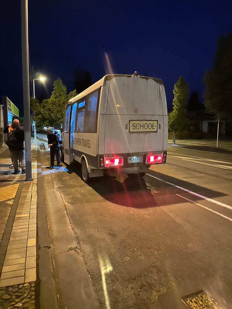 Um 05.50 Uhr geht es mit dem Schulbus zurück zum Trail. Ich weiss nicht genau warum mit dem Schulbus, finde es aber noch lustig.