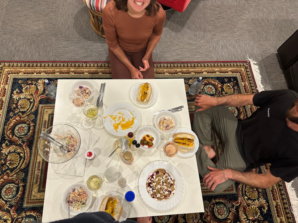 War ja klar. Das Kino läuft ohne uns. Passt uns allen. Wir sind mit Vino und Cider un poco am Kochen. Randen-Geisskäsesalat, Guaca und Chips und Hot Dog Party. Ein fantastischer Abend 💫.