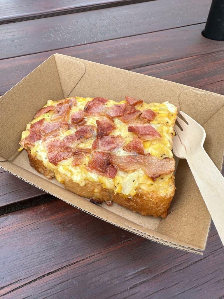 Zum zweiten Zmorgen (Nr. 1 war Joghurt mit Früchten) gab es das: Toast mit creamy Mais und Käse und Speck. Ich weiss leider leider leider nicht mehr wie es heisst, es hatte aber einen tollen Namen und war lecker. So was wie „strammer Max“ aber überhaupt nicht so. Vielleicht hat es im Namen ein Tier oder Handwerk drin. Vielleicht auch nicht. Es liegt mir auf der Zunge. Wer es heraus findet, darf es bitte einmal für mich kochen. What a deal 😏.