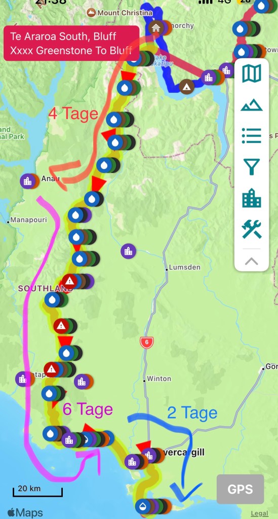 Dann habe ich noch meinen „Endspurt“ geplant. Von Greenstone nach Bluff. Noch 12 Tage laufen, so sagt die Planung.